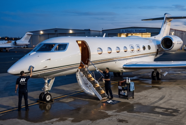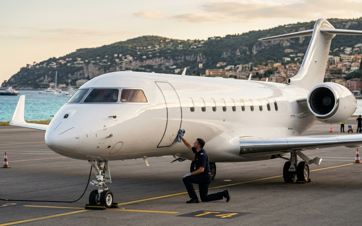 The turnaround service scope for a Cannes-to-Monaco aircraft is a condensed version of the full pre-departure package: exterior wash and decontamination to remove pollen, salt haze, and atmospheric fallout accumulated during the Cannes period; interior refresh including leather wipe-down and conditioning, carpet vacuum and spot treatment, galley sanitation, lavatory service, and window polish; and cabin odor treatment if the aircraft has carried active catering service during the Cannes festival period.